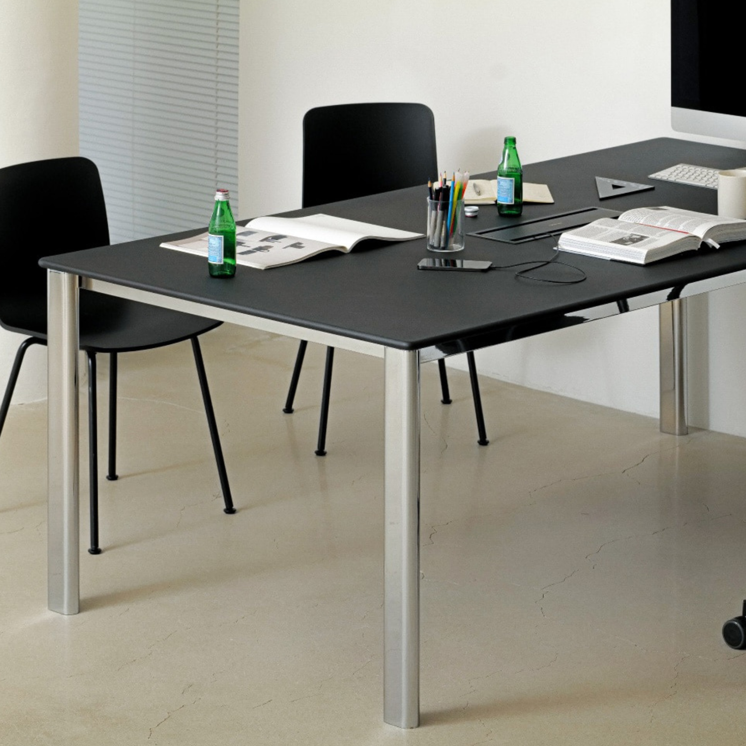 RRW MEETING TABLE 的標誌性設計在於其 10 種色彩可選的橢圓管加粗桌腿,為會議空間注入活力與美感,桌面不僅延續了觸感細膩的平滑處理,更內嵌了專用配電盒(插座槽),讓會議中的筆電、投影設備接線整齊美觀,大幅提升辦公效率。