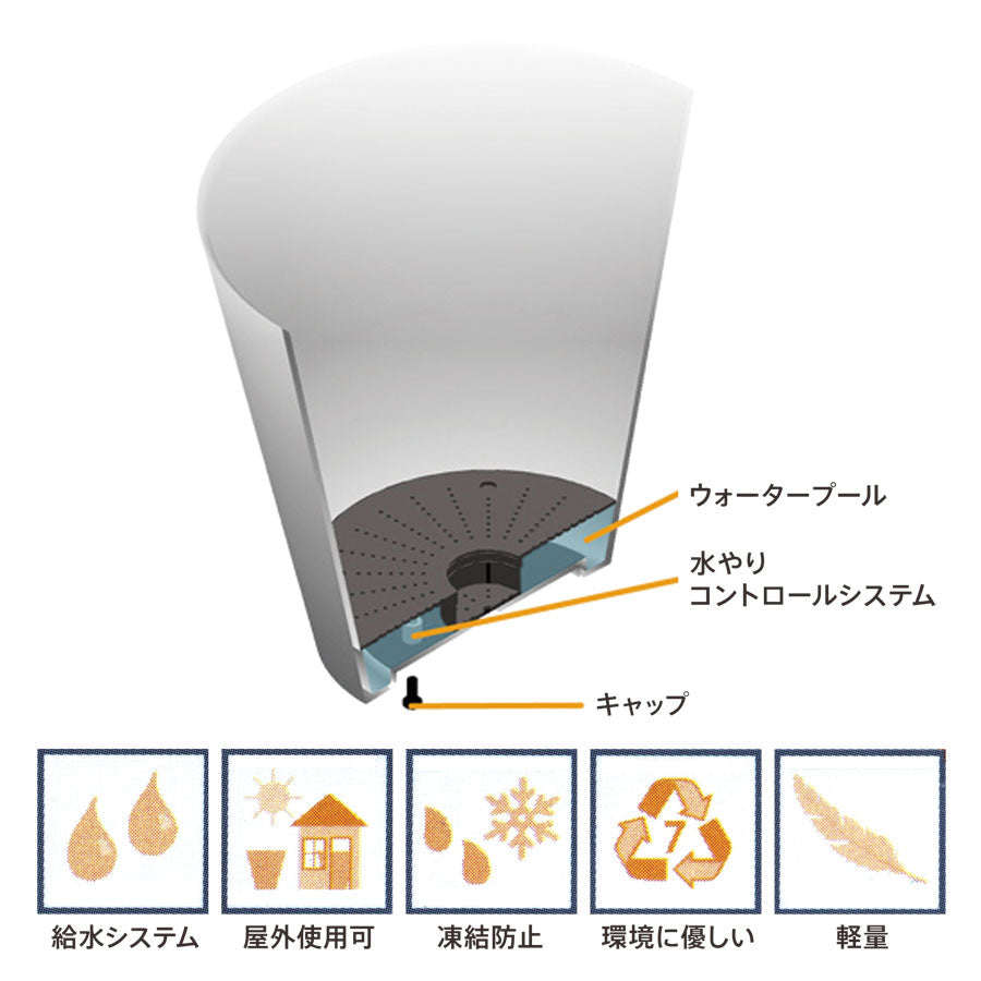 其獨特的設計能精準調節植物水分,當水量超過一定程度時,會自動從排水孔排出,有效防止爛根;而底部設有儲水空間,植物根系可根據需要自行吸取水分,達到防止乾旱的效果;外觀具有如天然原石般平滑的霧面質感,質樸且優雅,能與各種植物風格和室內空間美學完美契合。